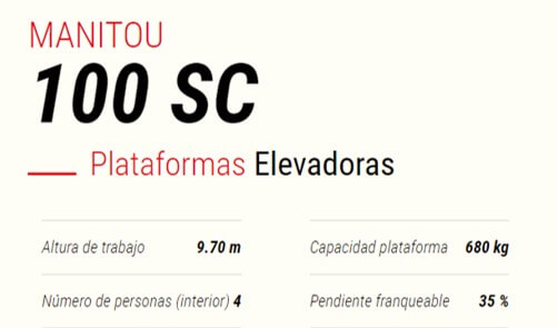 Descubra las prestaciones del elevador de tijera 100 SC. La plataforma de este modelo de tijera articulada tiene capacidad para 4 operadores. Su diseño compacto es ideal para trabajos en altura en espacios reducidos y zonas de difícil acceso – hasta 9,9 metros de altura. Por seguridad, la plataforma tiene un piso antideslizante de aluminio y los estabilizadores cuentan con nivelación automática. El Manitou 100 SC propone una extensión de la plataforma de más de 1500 mm, una transmisión de tracción en las 4 ruedas, un sistema de oscilación activa que le da a esta unidad una excelente capacidad todoterreno y un despeje de pendientes de hasta un 40 %.